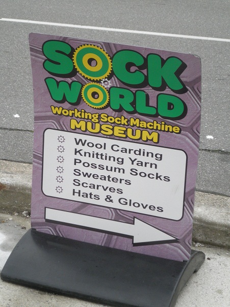 Det var en kombineret sokke- og garnforretning, dvs. de havde både mange og spændende sokker (Dobby ville have elsket den) og lækkert garn (ja, jeg købte noget, New Zealand er med på listen over undtagelser fra intet-garn-indkøbs-reglen), men derudover havde de også et helt rum fyldt med henved 30 antikke sokkestrikningsmaskiner. Linet op på rad og række! En af hovedattraktionerne på sokkehylderne var possum/merinosokker strikket på de antikke maskiner.