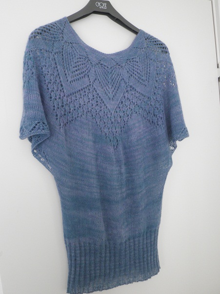 Jeg har lavet et par ændringer, der alle er dokumenteret på min Ravelry projekt side, men den væsenligste er, at jeg har strikket et godt langt stykke i glatstrik under ærmerne. Dette gør at trøjen går godt ned om hofterne (eller ville gøre, hvis ikke lige maven var i vejen) og ikke er helt så kort, som hvis man bare strikker efter opskriften. Det bliver ikke til billeder med “fyld” denne gang, for selvom jeg faktisk kan passe den selv med den højgravide mave, så er det synd at vise blusen i sådan udstrakt form, da den vil falde en del pænere uden maven indenunder. Efter at have færdiggjort så mange gamle projekter er jeg lidt i tvivl om, hvad jeg så skal strikke på… jeg må have tømt garnkurven og få kigget de igangværende projekter igennem.