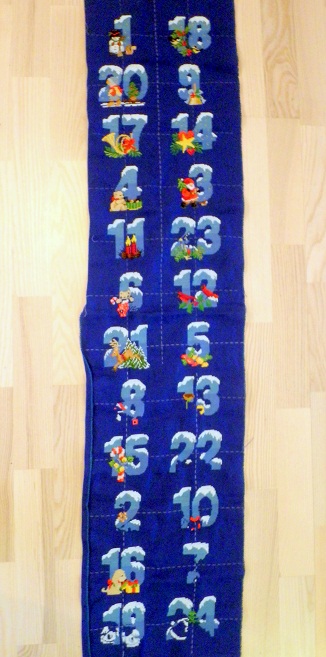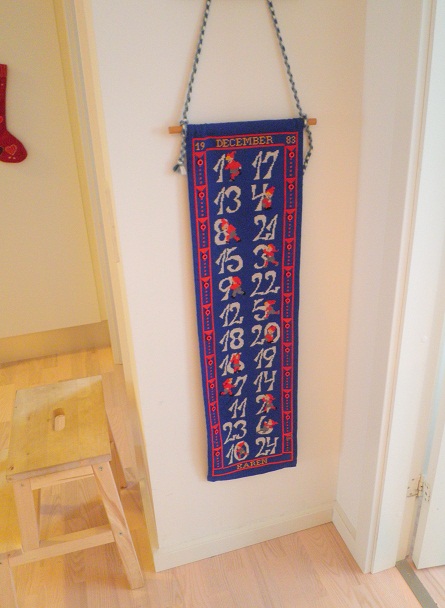 I also knew that my emergency substitution for MMs advent calendar was to be found in said box. It is my own advent calendar, which my fathers aunt (his mother’s sister) made for me for my first Christmas back in 1983. It now hangs ready for MMs presents, as his own calendar isn’t quite finished yet. I still believe that I might have managed to finish it, if the first month of LBs life had been kinder to me, but it is hard to tell. In any case, I’m far from feeling ashamed of utilizing this possibility of substitution. And then my goal for next year can be to finish advent calendars for both my sons (in any case I won’t be the only one embroidering another calendar).