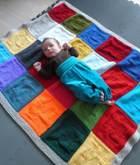 Da jeg kom hjem fra hospitalet (første gang) med LB ventede en stor pakke på mig. I pakken var der to store tæpper, et til MM og et til LB, syet sammen af lapper med elefantmotiver. 19 af gruppens medlemmer har strikket lapperne og sendt dem til én enkelt (søde Roseknits24-7), der syede dem sammen og strikkede kant. Da jeg pludselig stod der med tæpperne i hånden, og det kæmpe arbejde de har lagt i dette projekt gik op for mig, var jeg målløs. Jeg kom til at tude af bare overraskelse, rørelse og taknemmelighed over den varme og gavmildhed, som for mig er så stor en del af den virtuelle strikkeverden. Nu er det så lykkedes mig at tage et ordenligt billede af LB og hans tæppe og et af de to tæpper sammen, og jeg viser dem her på bloggen, fordi jeg så gerne vil sige ordentligt tak på vegne af mine drenge, der begge bruger deres tæpper meget.