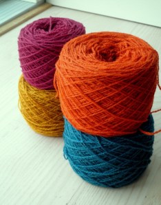 I have finished Miss Breezy (you’ll get pictures when I get someone to take photos), which means I get to play with some of my new yarn for designs. I am going to design a girl’s dress for Filcolana with a deadline for the trade show in August. It is the first time I’ll be designing a dress, so I’m planning to knit two of the sizes, just to see how it works. This gives me the opportunity to play with two widely different colour schemes. One of the dresses is going to be calm, mainly in grey, but with blue, purple and green tones in it. The other is going to be more wild, with a petrol main colour and complements in hot reds and oranges. So far, I haven’t gotten beyond the swatching and calculating, but before long I’m going to cast on, and I really look forward to it. By the way, the yarn is New Zealand Lambs Wool.