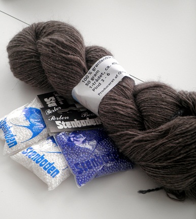 Da jeg var i Nuuk for nogle uger siden, var jeg selvfølgelig “nød” til at købe lidt lækker moskusgarn med hjem. Jeg valgte et bundt tyndt lacegarn og købte også nogle poser perler. Nu går jeg så og lurer på, hvad det skal blive til. Jeg har tænkt på et lille sjal med perler i den yderste del af mønsteret. Udfordringen er selvfølgelig, at jeg kun har det ene bundt, så opskriften må ikke kræve mere end 400 m garn.