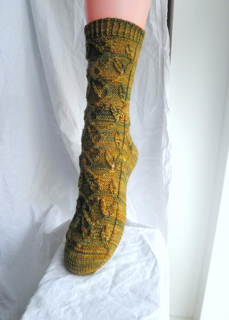 Airmid is named for the Celtic goddess associated healing and especially herbal healing. The socks features the twists of a herbal plant, sprouting leaves as it runs up the sock.