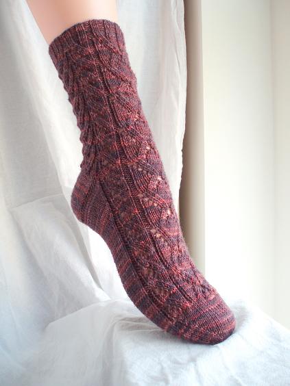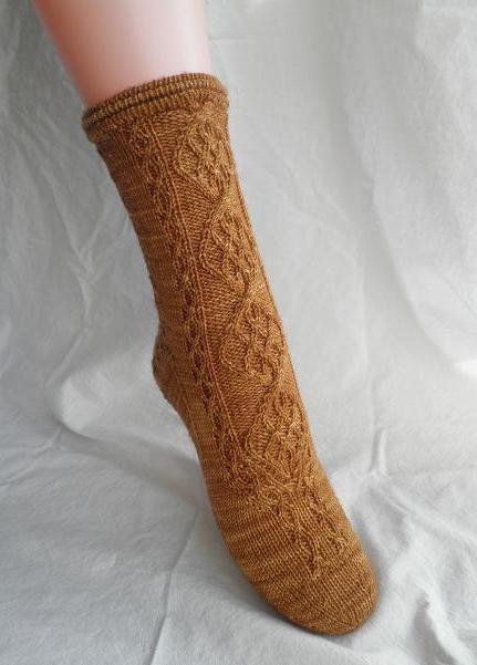 The Boudica sock is named for the Celtic rebel queen Boudica, who fought the Romans around 60 AD. The Roman contemporaries described her as tall, with reddish-brown hair flowing to beyond the waist. The lace pattern of the Boudica sock celebrates her flowing hair and fierce will.
