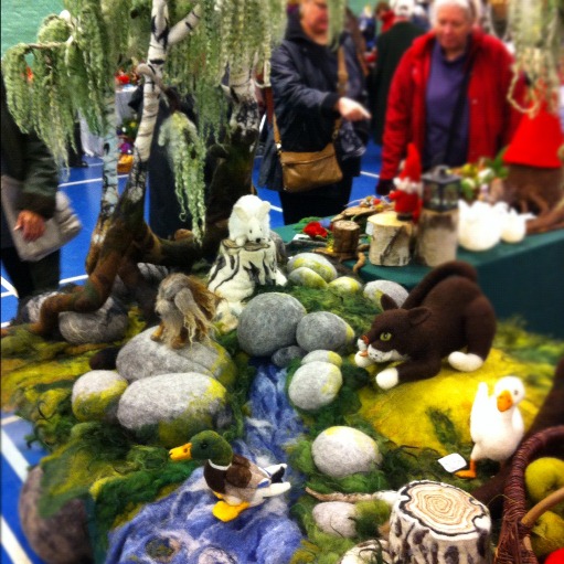 One of our favorite stalls was this fantastically fine needle felted landscape, complete with animals, trees, stones, and water. Both MM and I were fascinated. Unfortunately I didn’t remember to get a card, so I can’t tell who the artist was, but I did get permission to take a picture.