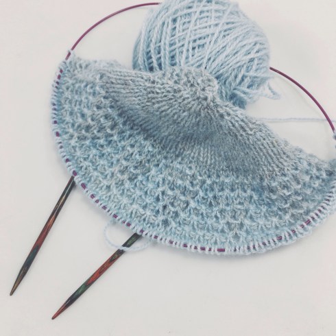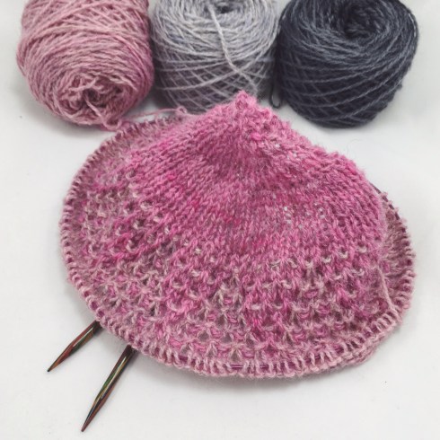 I don’t want this, so my plan is to only work six sections (thus I only have bought six colours) and make the sixth section the edge section. Thus I’m hoping I’ll end up with a reasonable size shawl, which will still be an Eiri, or rather a variation of Eiri. If I – the designer – can’t figure out that mod, I’d be pretty surprised. I only have 20 grams of the first three colours, while having 40, 60, and 60 gram of the last three. I hereby admit to having done absolutely no calculations in order to determine the amounts required for each section with this alternate yarn (hereby I give you a tip – do the math if you don’t like to knit dangerously). So it’s going to be exciting to see, if my gut feeling will be correct. So far I don’t have problems (please cross your fingers that this happy state continues).