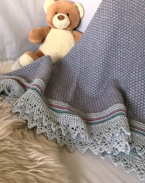 The blanket is knit using CaMaRose Hverdagsuld (100% wool; 150 m per 50 g), using 150 g of the main colour, and 100 g each of the two additional colours. You can find the pattern in English and Dansih in my Ravelry store here: Gnister Baby Blanket.