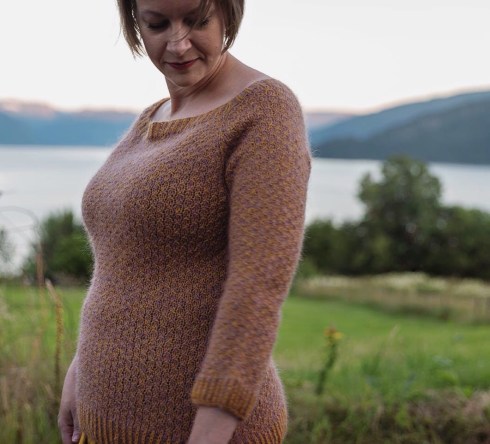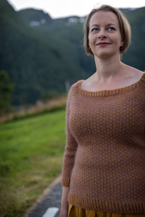 Falla is a light, airy and yet warm fall sweater. It is inspired by visions of the fall forest in the sunset light, piles of soft golden and red leaves along the forest floor, the soft light of autumn, and the thoughts of cozy gatherings to come as the days shorten. The sweater is cozy, warm and utterly soft. Knit in warm shades of falling leaves. The edges are knit in two-colour brioche, and are almost translucent – like the sun through the thinning foliage. The body and sleeves of the sweater is knit with both strands of yarns held together and knit in a simple, but beautiful textured pattern, which makes the colours blend beautifully yet still give an interesting texture.