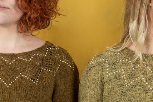 The idea behind Pearl Sisters was to design two sweaters, which could be knit from the same pattern just by switching out the charts. Therefore there is one chart for the version with two colour beads, and one chart for the version with lace and beading – which can also be knit just with the lace.