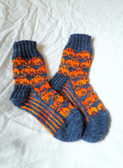 Now they adorne the feet of a very, very good friend (who agreed to get them as “payment” for posing with them for the camera), who perhaps could need to have a bit of sunshine on the feet. In any case, it’s hard to stay sombre when looking at the gorgeous, happy orange colour.