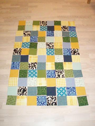 Lørdag aften, da MM var blevet puttet, gik jeg i gang med stofbunker, saks og store planer. En hel del timer senere (ahhh, at være natteravn… det er for længe siden sidst) havde jeg 96 firkanter betrukket med stof og klar til at blive syet sammen i hånden. Jeg er nu færdig med de første 4 rækker, dvs. en tredjedel af tæppet, så det går skam fremad. Jeg aner stadig ikke, hvordan jeg skal bære mig ad med at quilte det, men den tid, den sorg. Det er i hvert fald hyggeligt at sidde og sætte de små stykker sammen lidt af gangen.