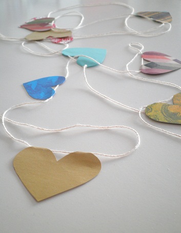 Det hele startede i søndags, da jeg så Tusindfryds hjerteranker. Jeg fik sådan lyst til at lave nogle til os selv, og heldigvis har jeg i mit lager også temmelig meget lækkert papir, der bød sig til. Det er blevet til tre ranker, for jeg kan bedst lide, at de ikke hver især er alt for lange. Så er det nemmere, at hænge dem op.