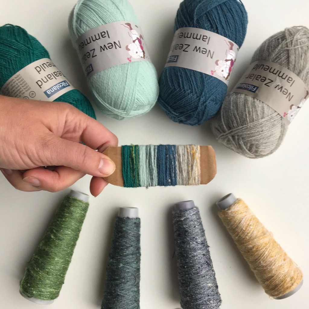 Vintersolhvervssjalet strikkes i 8 farver garn. De fire farver skal være tynd uld (ca. 300 m pr. 50 g) og de 4 andre en tynd følgetråd (7-800 m pr. 50 g). Der kan købes kits med garn, opskrift og overraskelse hos garnvärk (via dette link), men man kan også nøjes med at købe medløbertråden eller man kan gå på jagt på lageret og bare købe opskriften (den kan fås både hos garnvärk eller via min Ravelryside).