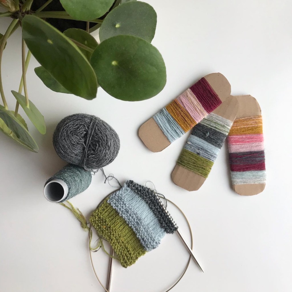 The shawl is knit using 8 colours of yarn and 2 different yarn types. One yarn should be a thin wool (approx. 300 m per 50 g) – you will need 4 colours. The other is a thinner yarn – lace or even thinner (7-800 m per 50 g) to hold together with the thin wool. Kits with yarn, pattern and a surprise are avaiable from garnvärk, but you can also just buy the pattern (both from garnvärk and from my Ravelry page) and knit from your stash.