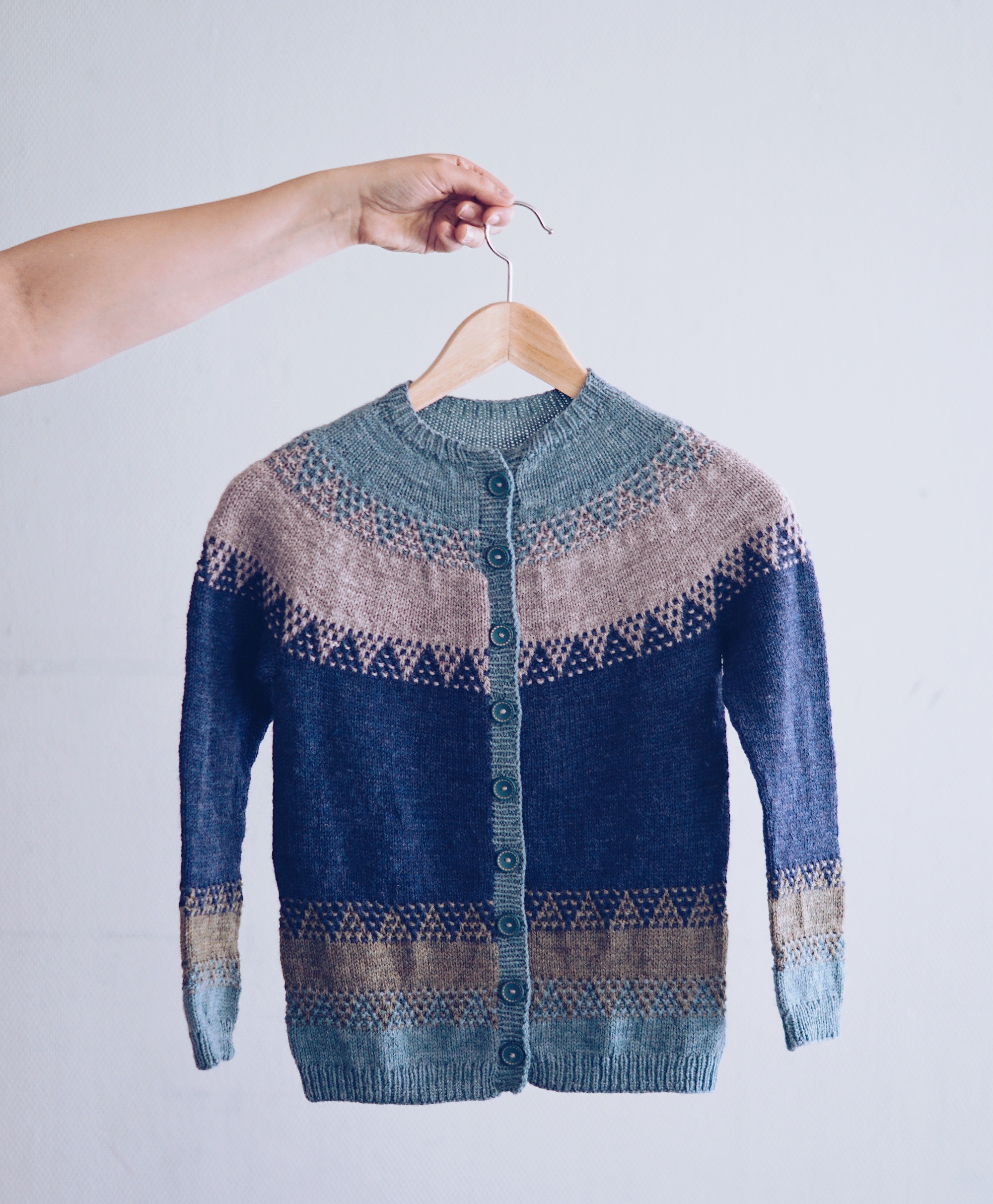 Eiri Junior is the second pattern of my Eiri cardigan series (the first was Eiri Baby, and Eiri Voksen (=adult) is on its way as well) inspired by the mosaic pattern of the Eiri shawl. I am still utterly in love with this pattern, and I love how well it fits any sex and how many colour combinations suits it. The pattern is also easy and fun to knit, which is a happy bonus.