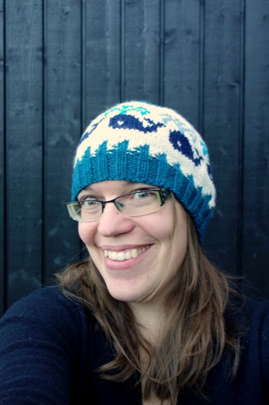 If you don’t have quite the big head (whale head?) I do, you can probably get away with just knitting with the bigger needles and yarn (and skipping the extra repeat). I’ve also change a couple of other things (because I can’t resist), thus the ribbing is longer and the white section taller. That way I got enough room for the slightly bigger water spouts (I tweaked the original slightly). I had an idea that it would be cool with spouts in several colours, so I just knit white after the whales. Afterwards I used duplicate stitches to emboider on two different colours of spouts (Peruvian col. 224 and an unknown light blue from the stash).