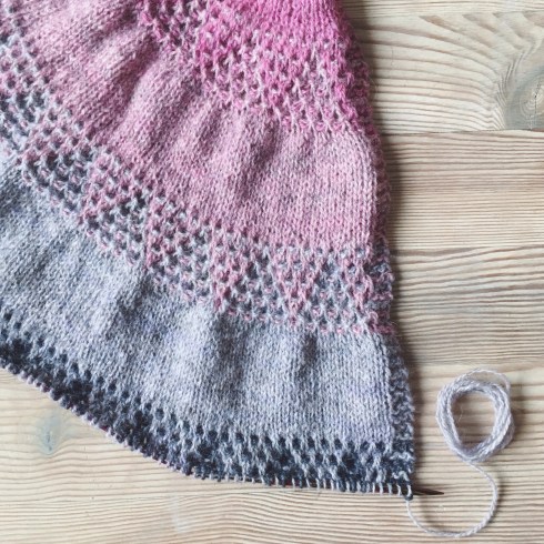 I don’t want this, so my plan is to only work six sections (thus I only have bought six colours) and make the sixth section the edge section. Thus I’m hoping I’ll end up with a reasonable size shawl, which will still be an Eiri, or rather a variation of Eiri. If I – the designer – can’t figure out that mod, I’d be pretty surprised. I only have 20 grams of the first three colours, while having 40, 60, and 60 gram of the last three. I hereby admit to having done absolutely no calculations in order to determine the amounts required for each section with this alternate yarn (hereby I give you a tip – do the math if you don’t like to knit dangerously). So it’s going to be exciting to see, if my gut feeling will be correct. So far I don’t have problems (please cross your fingers that this happy state continues).