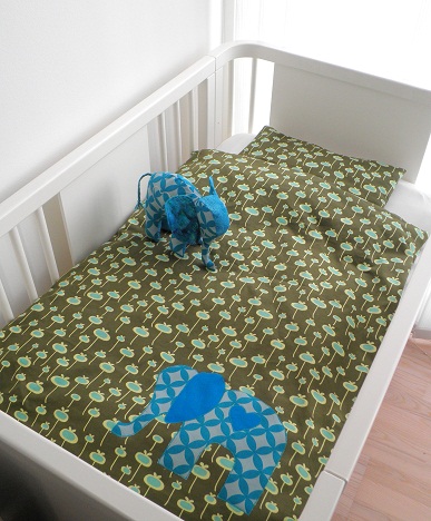 Besides the more common things, like remembering to buy diapers in miniature size, I’ve managed a bit of creative nesting today. I’ve sewn a new duvet and pillowcover for LB with an elephant application (of course), and since I already had sorted out fabric and sewing machine, I couldn’t help myself, but made an elephant softie as well. It was good to make another, since it has been too long since I last sewed one of my luckyphants.