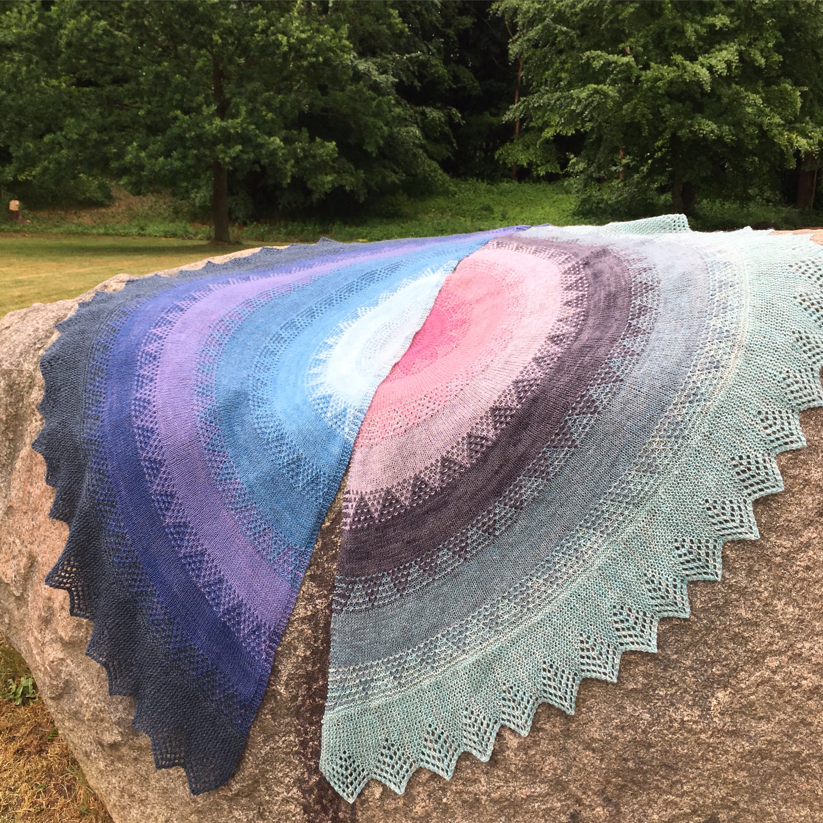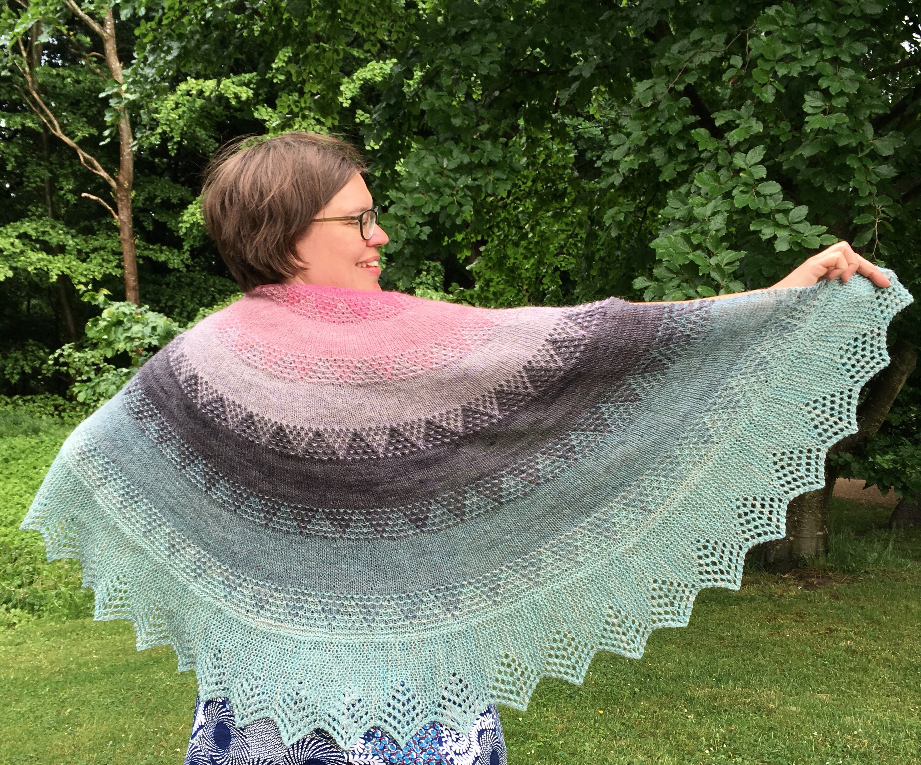 But now they are both finished – and oh boy, they are gorgeous both of them. It is also rather interesting to see that my “sunset over Fanø” version in the Hampshire 4-ply yarn from The little grey sheep has turned out almost as big as the indigo version in yarn from g-uld, even though there are seven colours in the latter and only six in the first. That’s the magic of gauge and different yardages.