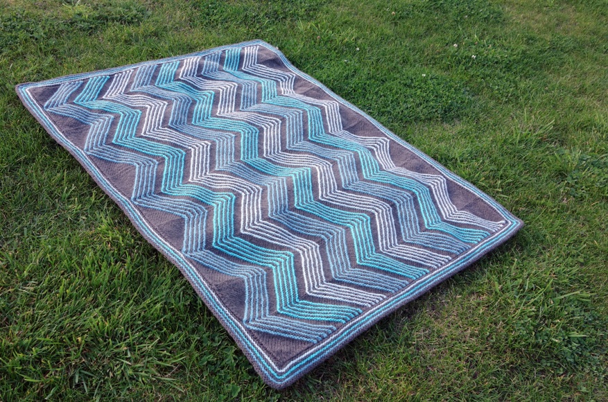 Midten af tæppet startes med en midlertidig opslagning, hvorefter der strikkes frem og tilbage. Efterfølgende samles der op rundt langs kanterne, og kanten strikkes rundt.