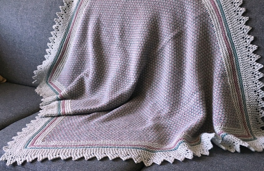 The centre of the blanket is knit flat from a provisional cast on. Stitches are then picked up all round the centre and the edge is worked round.