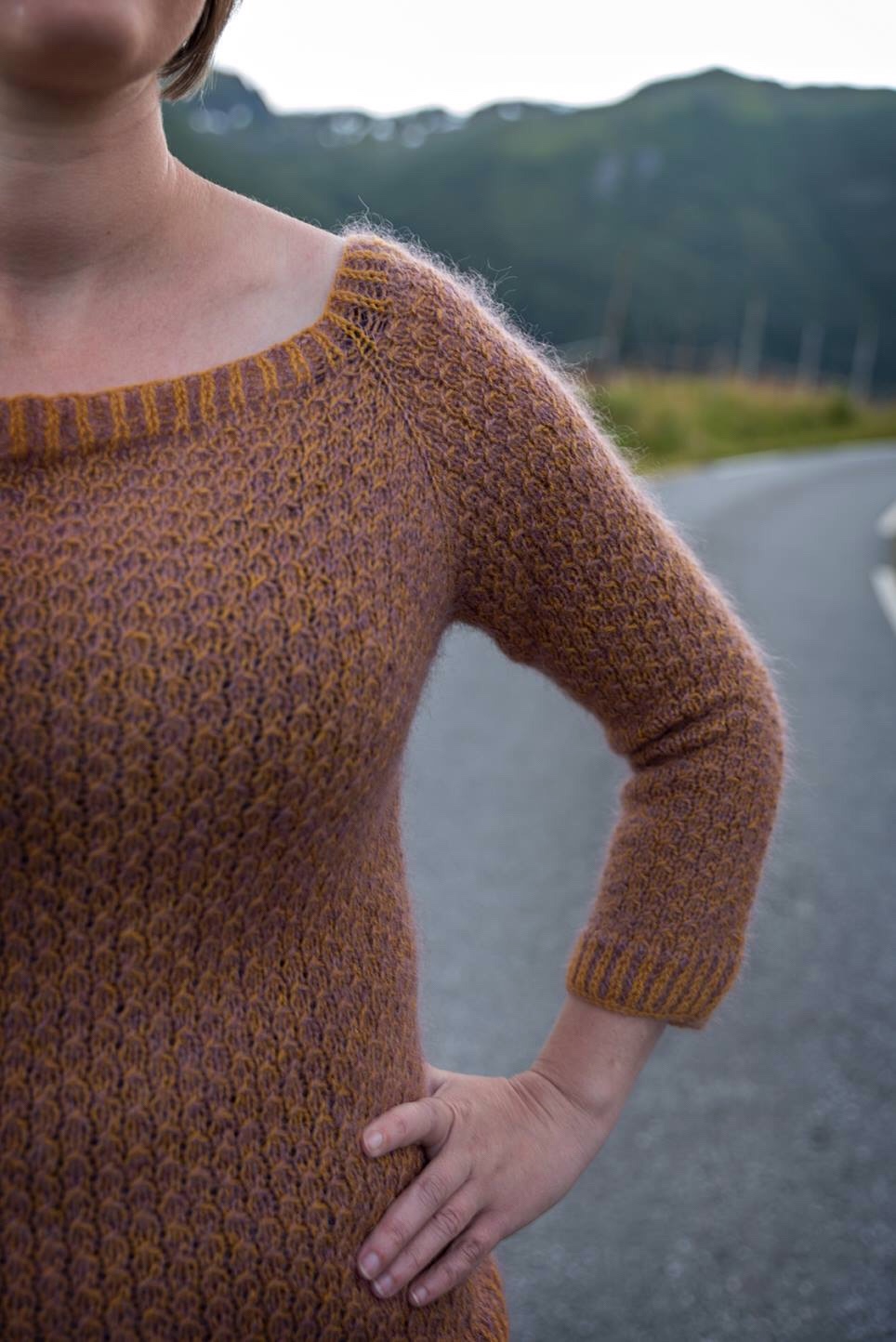 Falla is a light, airy and yet warm fall sweater. It is inspired by visions of the fall forest in the sunset light, piles of soft golden and red leaves along the forest floor, the soft light of autumn, and the thoughts of cozy gatherings to come as the days shorten. The sweater is cozy, warm and utterly soft. Knit in warm shades of falling leaves. The edges are knit in two-colour brioche, and are almost translucent – like the sun through the thinning foliage. The body and sleeves of the sweater is knit with both strands of yarns held together and knit in a simple, but beautiful textured pattern, which makes the colours blend beautifully yet still give an interesting texture.