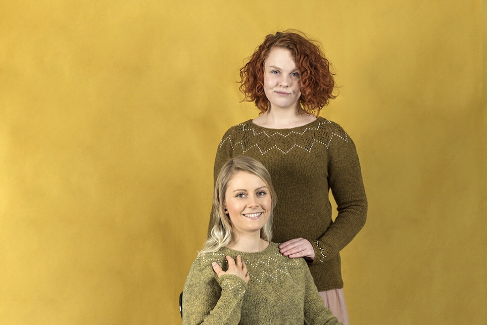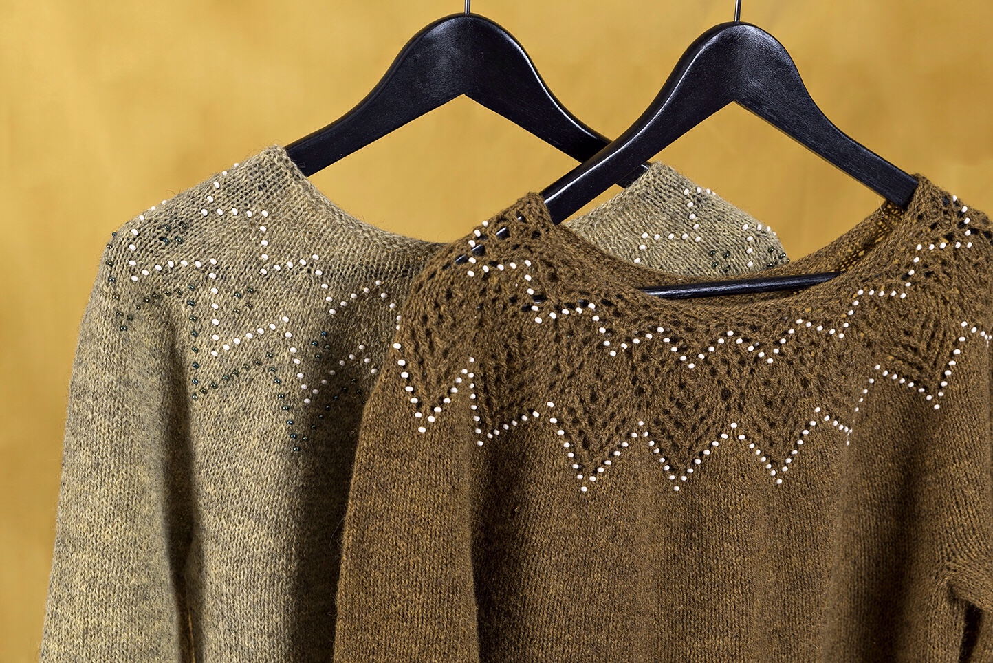 The idea behind Pearl Sisters was to design two sweaters, which could be knit from the same pattern just by switching out the charts. Therefore there is one chart for the version with two colour beads, and one chart for the version with lace and beading – which can also be knit just with the lace.